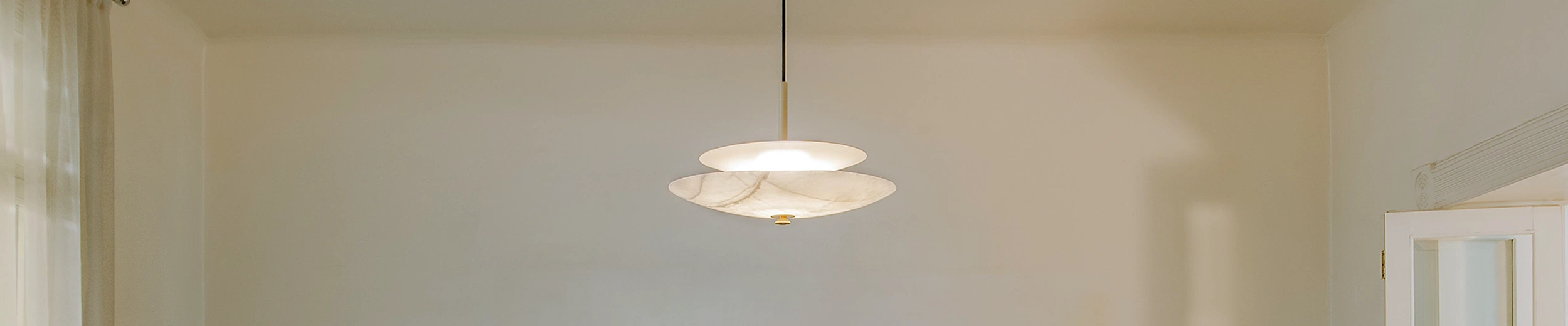 La lámpara colgante FASE OYSTER contiene una fuente de luz LED ubicada dentro de los platos de ónix y metal con acabado oyster white. La luz se esparce en el disco metálico y simultáneamente se extiende a través de las propiedades translúcidas de la piedra. Creando una luz tenue y estable como lo otorga la luna.