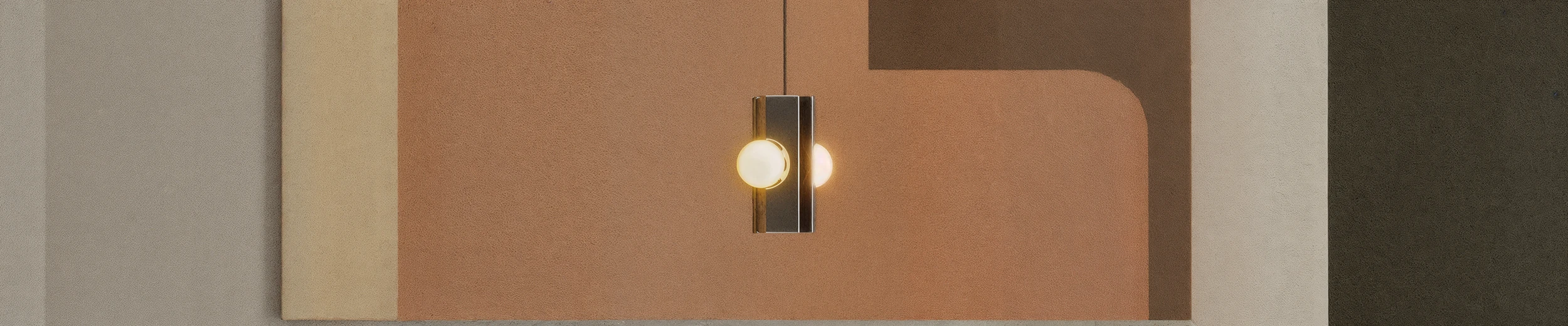La lámpara colgante FLUX se suspende mediante un cable que se une a un eje central de metal con acabado en pintura electrostática. Desde este eje emergen lateralmente dos difusores esféricos de vidrio opalino, cada uno conteniendo una fuente de luz. Ambos difusores están envueltos parcialmente por dos láminas de acero inoxidable con un acabado cepillado, el cual está orientado en dirección al eje longitudinal de la luminaria, lo que aporta un efecto visual dinámico y un equilibrio formal en su composición.